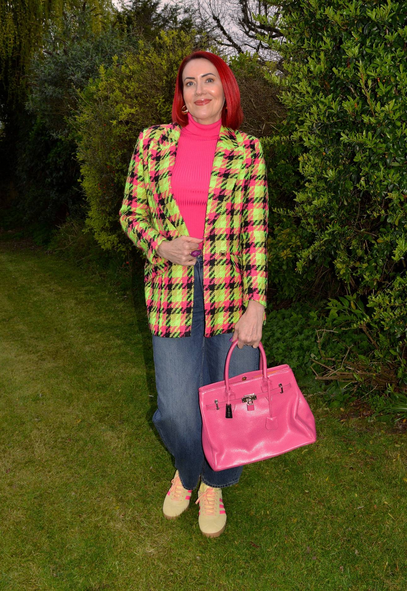 Every spring, I seem to be drawn towards neon shades. I think it’s the need for bright colours after the dreary winter months. It’s been almost two years since I last wore this neon check jacket…with the same jumper. Well, when you find a combination that works it’s worth repeating! Back then I wore it with pink trousers. On this occasion, I’ve teamed it with…